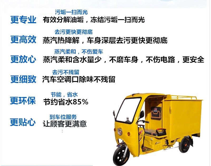采用蒸汽高壓技術洗車,引進歐美先進技術,擁有清水、泡沫、吸塵、風干、鍍膜、除臭、凈手、玻璃水添加、防凍等齊全的功能,省水省電、節能環保、機型美觀、性能穩定,節省費用,方便實用